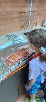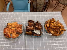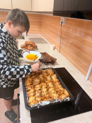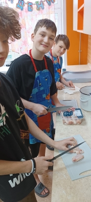 Мы вместе с ребятами взялись за дело и приготовили целое меню: хрустящие крылышки, нежные рёбрышки и наш особенный салат "Бонито". В салате мы смешали морковку по-корейски, сыр и копчёную курицу – получилось очень вкусно и ярко.